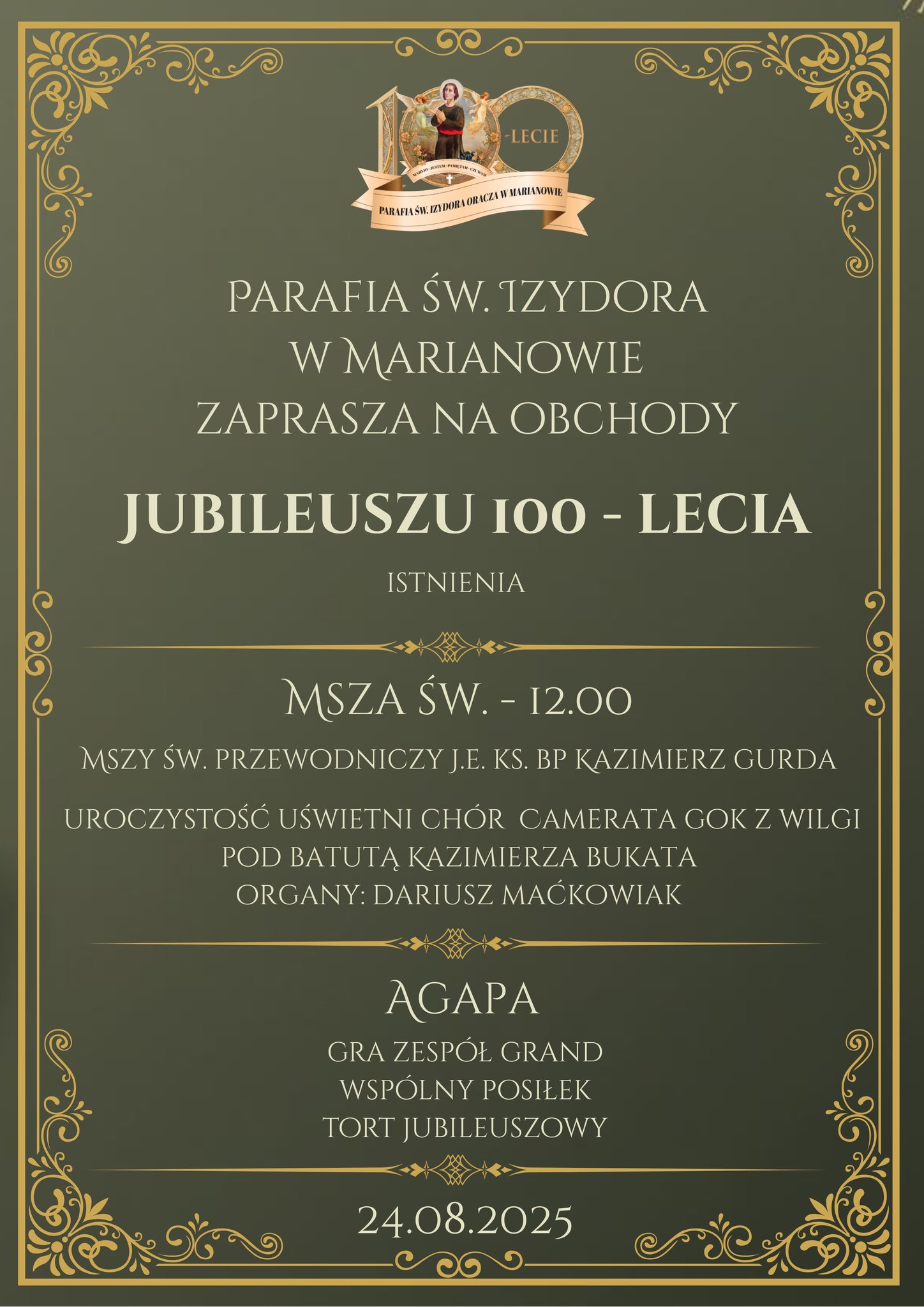 Parafia św. Izydora Oracza w Marianowie w dekanacie garwolińskim, zaprasza na wyjątkowe uroczystości z okazji jubileuszu 100-lecia istnienia parafii, połączone z odpustem ku czci Najświętszej Maryi Panny Częstochowskiej.