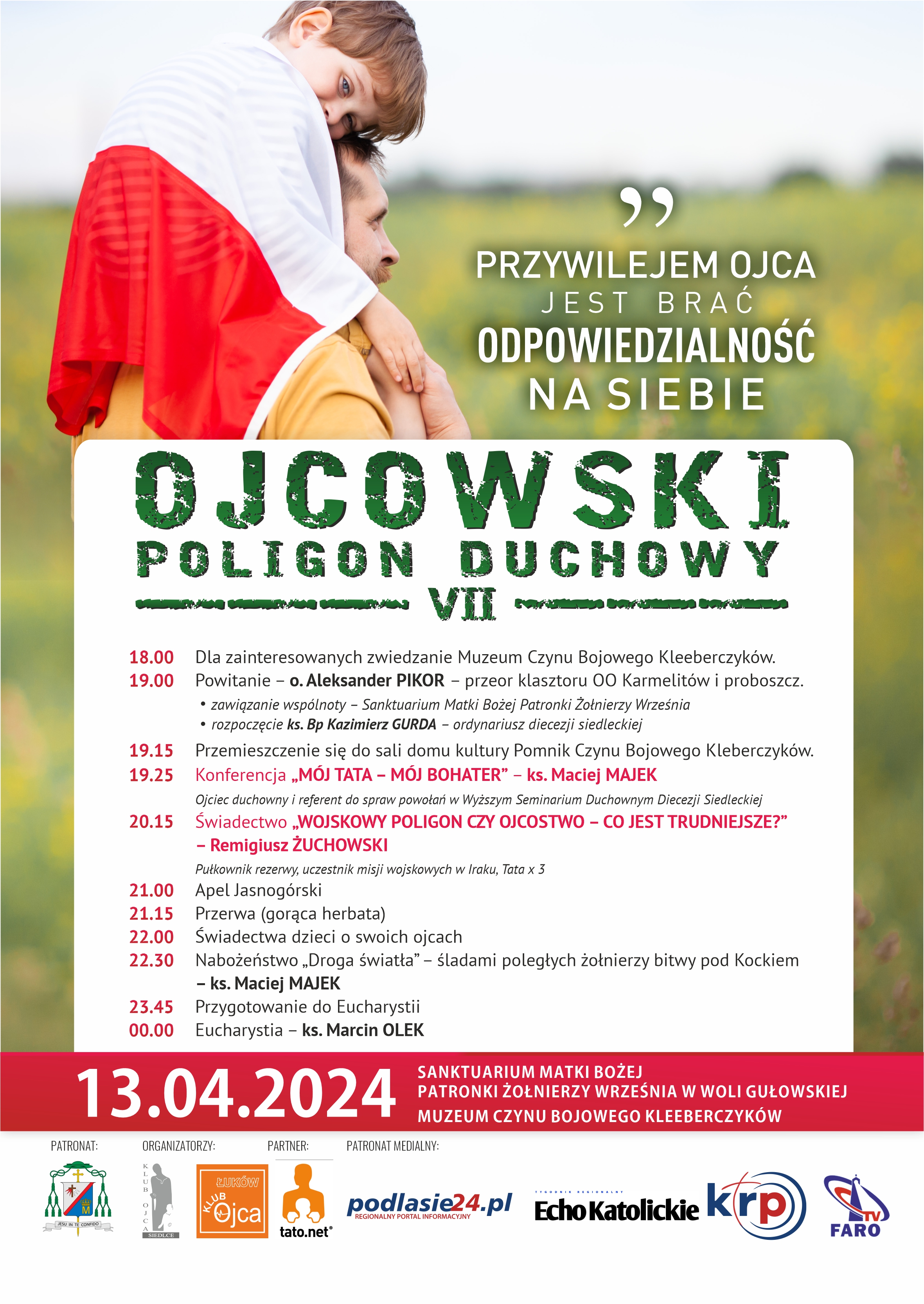 W sobotę, 13 kwietnia w Sanktuarium Matki Bożej Patronki Żołnierzy Września w Woli Gułowskiej odbędzie się VII Ojcowski Poligon Duchowy. Hasło tegorocznego spotkania brzmi: „Przywilejem Ojca jest brać odpowiedzialność na siebie”.
