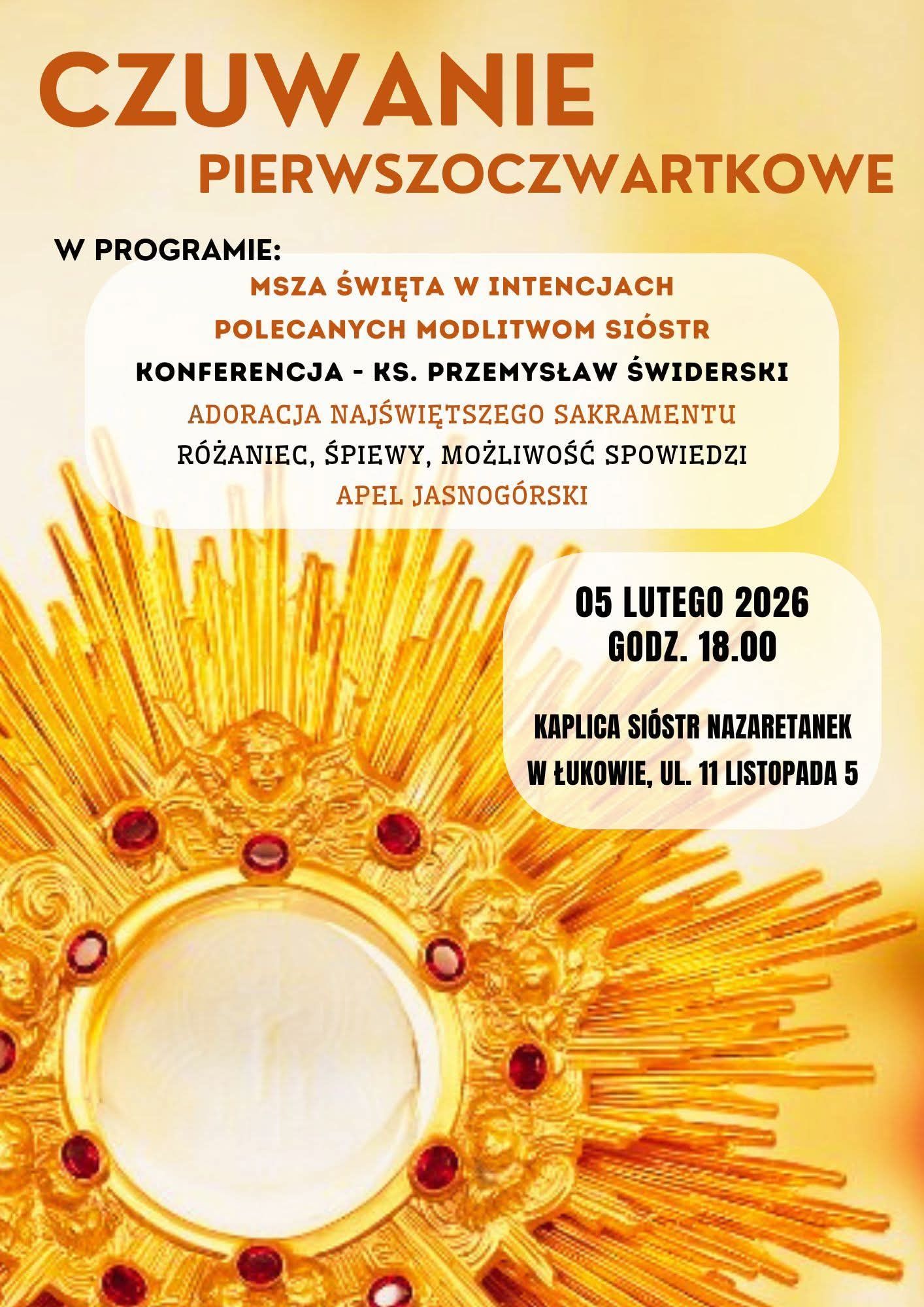 Pierwszoczwartkowe Czuwanie rozpocznie Msza Święta. Po Eucharystii konferencję wygłosi ks. Przemysław Świderski, dyrektor Katolickiego Radia Podlasie. Następnie odbędzie się adoracja Najświętszego Sakramentu, różaniec i śpiewy. Będzie też możliwość przystąpienia do spowiedzi świętej. Tradycyjnie czuwanie zakończy się Apelem Jasnogórskim.