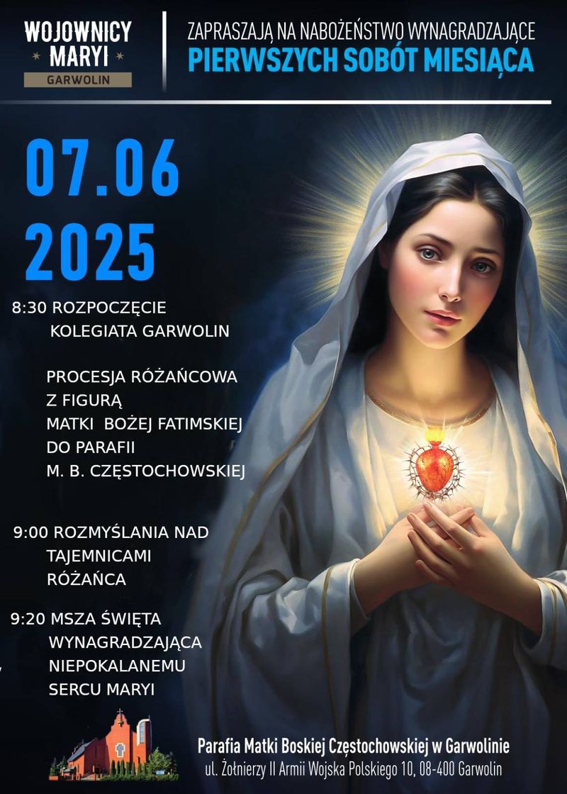 Publiczny Różaniec prowadzony przez Wojowników Maryi odbędzie się w Garwolinie w sobotę, 7 czerwca. Do udziału w modlitwie wynagradzającej w duchu nabożeństw pierwszych sobót miesiąca zaproszone są całe rodziny.
