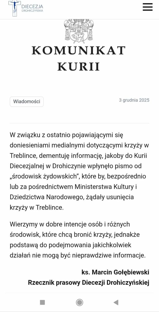 „W związku z ostatnio pojawiającymi się doniesieniami medialnymi dotyczącymi krzyży w Treblince, dementuję informację, jakoby do Kurii Diecezjalnej w Drohiczynie wpłynęło pismo od ‘środowisk żydowskich’, które by, bezpośrednio lub za pośrednictwem Ministerstwa Kultury i Dziedzictwa Narodowego, żądały usunięcia krzyży w Treblince.