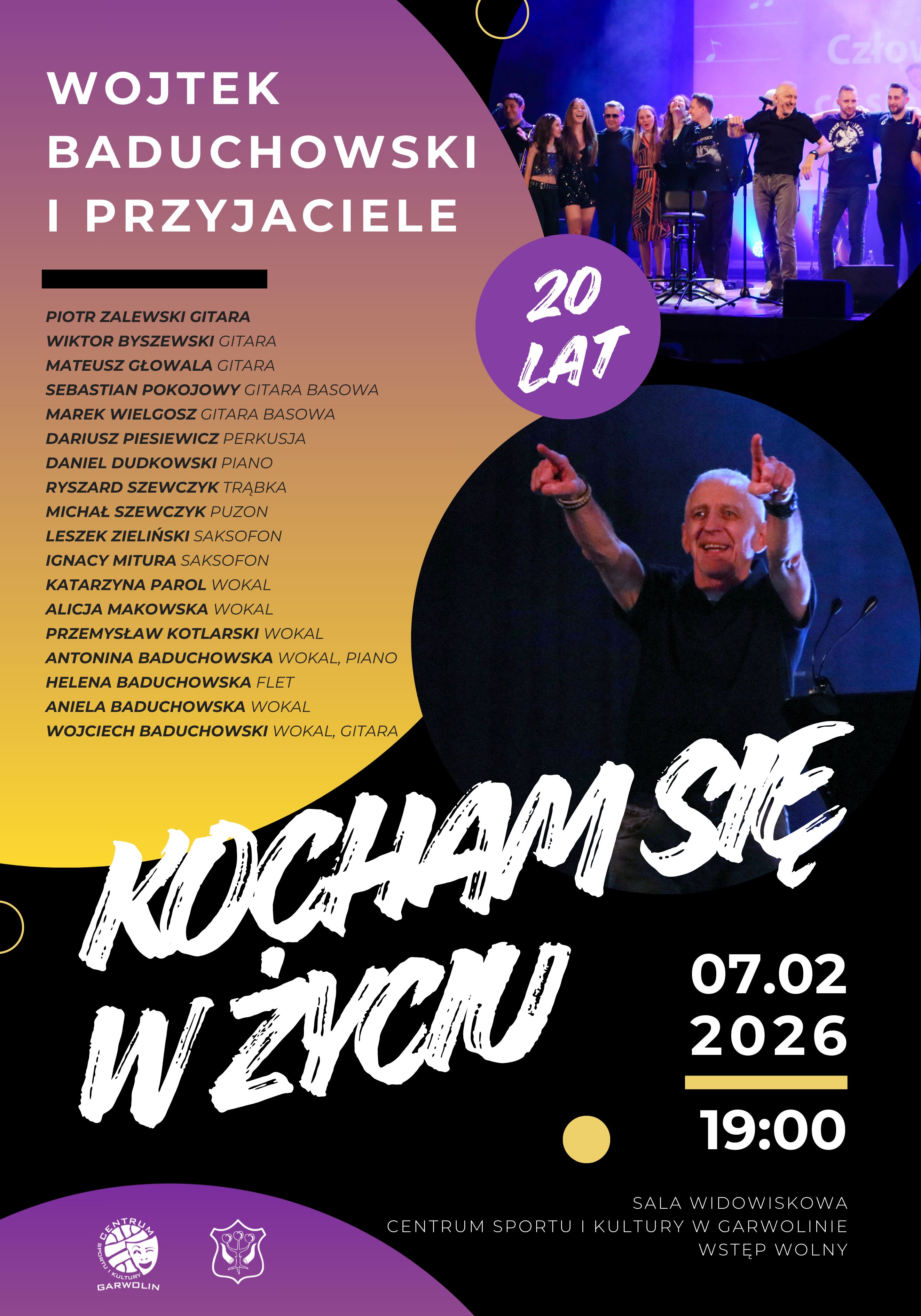 Centrum Sportu i Kultury w Garwolinie zaprasza 7 lutego o godz. 19:00 na wyjątkowy jubileuszowy koncert Wojtka Baduchowskiego i Przyjaciół pod tytułem „Kocham się w życiu”. Dwadzieścia lat wspólnej muzycznej pasji, przyjaźni i niezapomnianych emocji. Wstęp wolny.