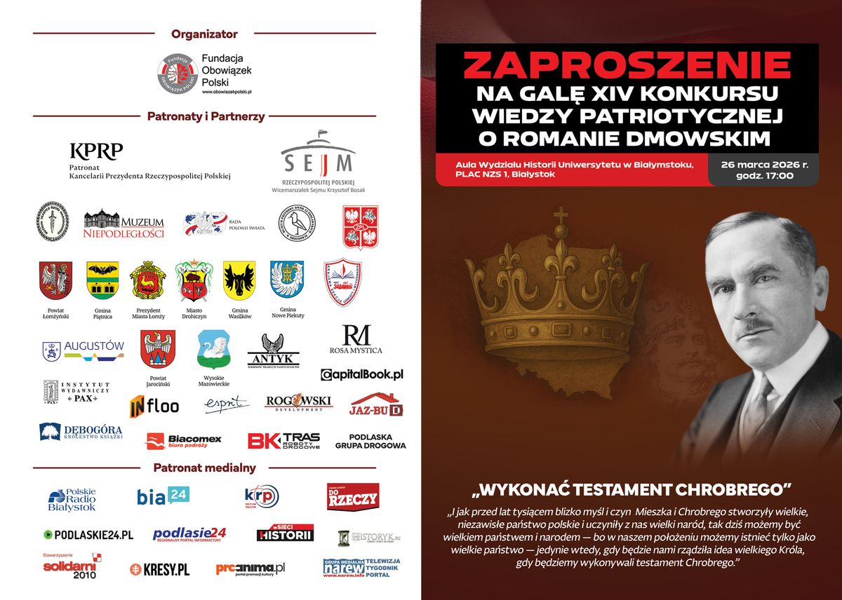 W Białymstoku odbędzie się finał XIV edycji Konkursu Wiedzy Patriotycznej poświęconego Romanowi Dmowskiemu. Tegoroczna gala zaplanowana na 26 marca będzie miała szczególny charakter – wydarzenie po raz pierwszy zyskało międzynarodowy wymiar. Uroczystość odbędzie się w siedzibie Wydziału Historii Uniwersytetu w Białymstoku, mieszczącej się w dawnym gmachu PZPR.
