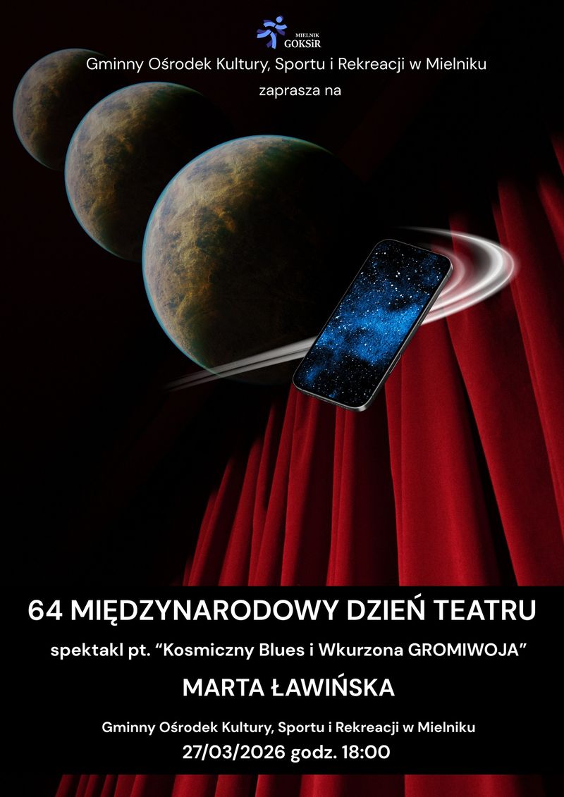 W Mielniku odbędzie się wydarzenie artystyczne wpisujące się w obchody Międzynarodowego Dnia Teatru. Już w piątek, 27 marca w sali widowiskowej GOKSiR zaprezentowany zostanie spektakl pt. „Kosmiczny Blues i Wkurzona GROMIWOJA” w wykonaniu Marty Ławińskiej – aktorki związanej z regionem.