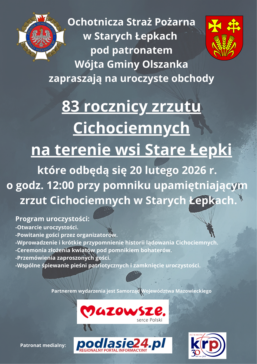 Obchody 83. rocznicy zrzutu Cichociemnych w Starych Łepkach odbędą się w piątek, 20 lutego, o godz. 12:00. W programie przewidziano złożenie kwiatów, przypomnienie historii lądowania Cichociemnych oraz wspólne śpiewanie pieśni patriotycznych. Wydarzenie będzie okazją do oddania hołdu bohaterom, a także do wspólnej refleksji nad historią i znaczeniem tamtych wydarzeń dla lokalnej społeczności.Organizatorem uroczystości jest Ochotnicza Straż Pożarna w Starych Łepkach, pod patronatem Wójta Gminy Olszanka Dariusza Wojtczuka. Patronat medialny nad wydarzeniem sprawują KRP oraz portal Podlasie24.pl.