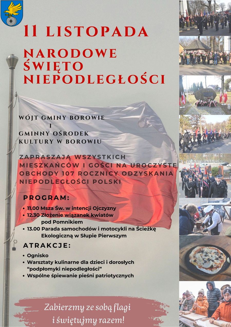 W tym roku Polska obchodzi 107. rocznicę odzyskania niepodległości – ważny moment w naszej historii, który łączy pokolenia i budzi dumę z bycia wolnym Polakiem. Również Borowie przygotowało dla mieszkańców i gości wyjątkowy program, pełen patriotycznych wydarzeń i rodzinnej atmosfery.
