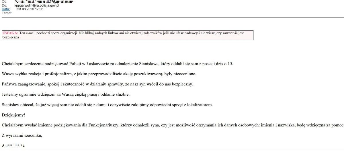 Do Komendy Powiatowej Policji w Garwolinie dotarł również e-mail z podziękowaniami, w którym matka chłopca wyraziła wdzięczność za profesjonalizm policjantów. Poszukiwania nie trwały długo, ale wywołały ogromne emocje zarówno u matki, jak i u interweniujących funkcjonariuszy. Na szczęście wszystko zakończyło się szczęśliwie.