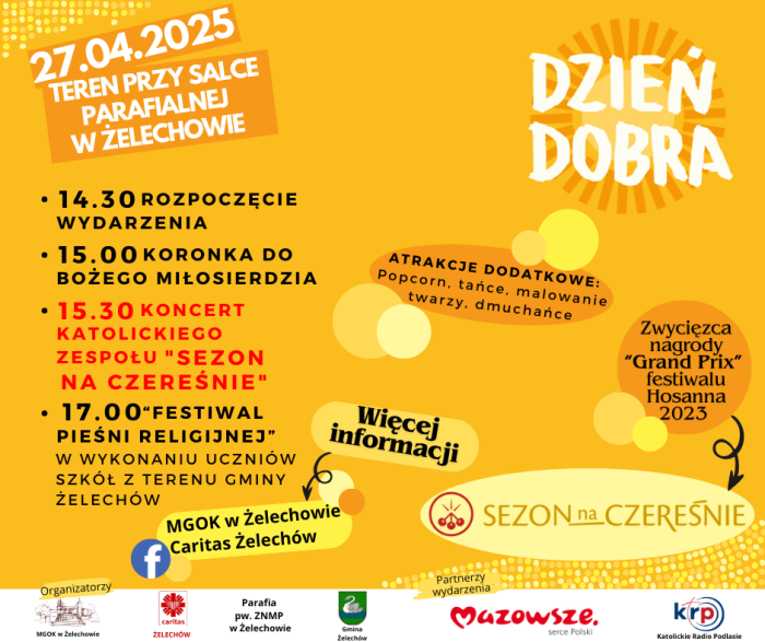 Spotkanie rozpocznie się o godz. 15.00 Koronką do Bożego Miłosierdzia. Następnie - o 15.30 wystąpi gwiazda tego popołudnia - zespół "Sezon na czereśnie". To wyjątkowy chrześcijański zespół, którego hasłem przewodnim jest biblijny cytat: "Abyście szli i owoc przynosili". Ich koncert będzie znakomitą okazją do wspólnego uwielbienia Boga poprzez muzykę i śpiew. A o godz. 17.00 po raz pierwszy odbędzie się Festiwal Pieśni Religijnej, podczas którego wystąpią młodzi artyści z terenu Gminy Żelechów.Organizatorami wydarzenia są: Miejsko-Gminny Ośrodek Kultury w Żelechowie, Caritas Żelechów, Parafia pw. ZNMP w Żelechowie i Gmina Żelechów.