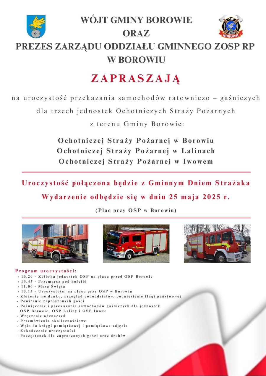 Dzień Strażaka jest okazją do wyrażenia wdzięczności za ich ciężką pracę, poświęcenie i odwagę, a także uhonorowania służby, która ratuje mienie i ludzkie życie. Strażackie uroczystości w Borowiu rozpoczną się 25 maja Mszą św. odprawioną w kościele parafialnym o godz.11:00, następnie strażackie pododdziały i uczestnicy celebry przemaszerują na plac przy OSP Borowie, gdzie przekazane zostaną jednostkom OSP w Borowiu, Lalinach i Iwowem nowe samochody ratowniczo – gaśnicze, a zasłużeni druhowie otrzymają odznaczenia resortowe.