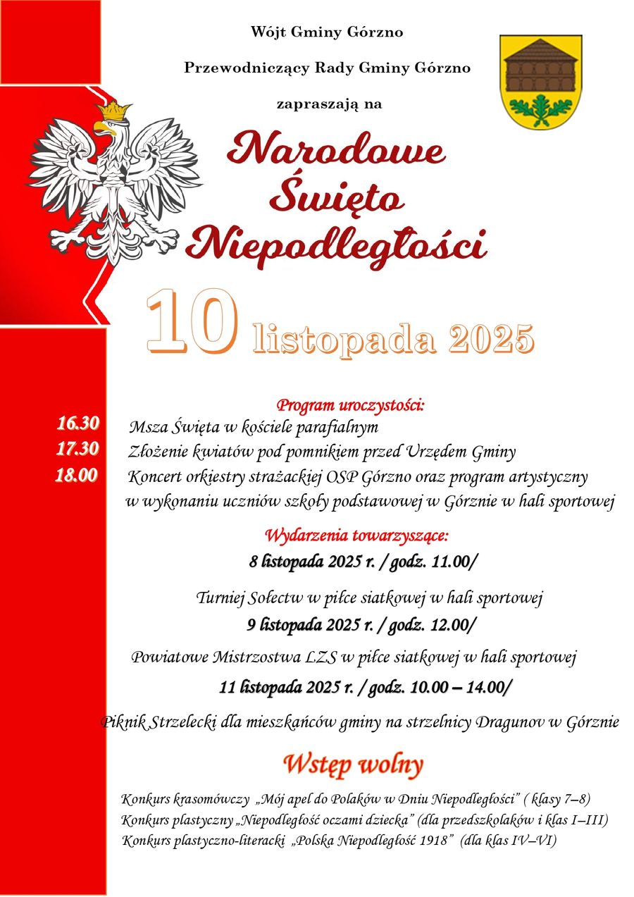 – 11 listopada to dzień szczególny w historii naszej ojczyzny i naszej gminy. Dlatego serdecznie zapraszam wszystkich mieszkańców, a także gości do wspólnego świętowania – mówi wójt Waldemar Sabak.Główne uroczystości odbędą się 10 listopada. O godzinie 16:30 w kościele parafialnym w Górznie odprawiona zostanie Msza św. w intencji Ojczyzny. Po nabożeństwie, około godziny 17:30, uczestnicy złożą kwiaty pod pomnikiem przed urzędem gminy. Następnie wszyscy zaproszeni będą mogli wysłuchać koncertu orkiestry dętej OSP Górzno oraz obejrzeć program artystyczny przygotowany przez uczniów miejscowej szkoły podstawowej.