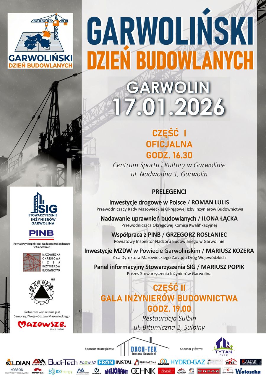 I Inauguracyjny Dzień Budowlanych odbędzie się 17 stycznia w Centrum Sportu i Kultury. Organizuje je nowo powstałe Stowarzyszenie Inżynierów Garwolina. W programie znalazły się prelekcje ekspertów związanych z branżą budowlaną oraz samorządami. Roman Lulis, przewodniczący Rady Mazowieckiej Okręgowej Izby Inżynierów Budownictwa omówi inwestycje drogowe w Polsce. Ilona Łącka, przewodnicząca Okręgowej Izby Kwalifikacyjnej przedstawi temat nadawania uprawnień budowlanych. Grzegorz Rosłaniec, Powiatowy Inspektor Nadzoru Budowlanego w Garwolinie poruszy kwestie współpracy z nadzorem budowlanym, a Mariusz Kozera, zastępca dyrektora Mazowieckiego Zarządu Dróg Wojewódzkich opowie o inwestycjach MZDW w powiecie garwolińskim.Panel informacyjny poprowadzi prezes Stowarzyszenia Inżynierów Garwolina Mariusz Popik. W wydarzeniu wezmą udział również przedstawiciele Urzędu Marszałkowskiego, wojewody, powiatowi inspektorzy nadzoru budowlanego z okolicznych powiatów, władze powiatu i miasta oraz liczne organizacje branżowe.
