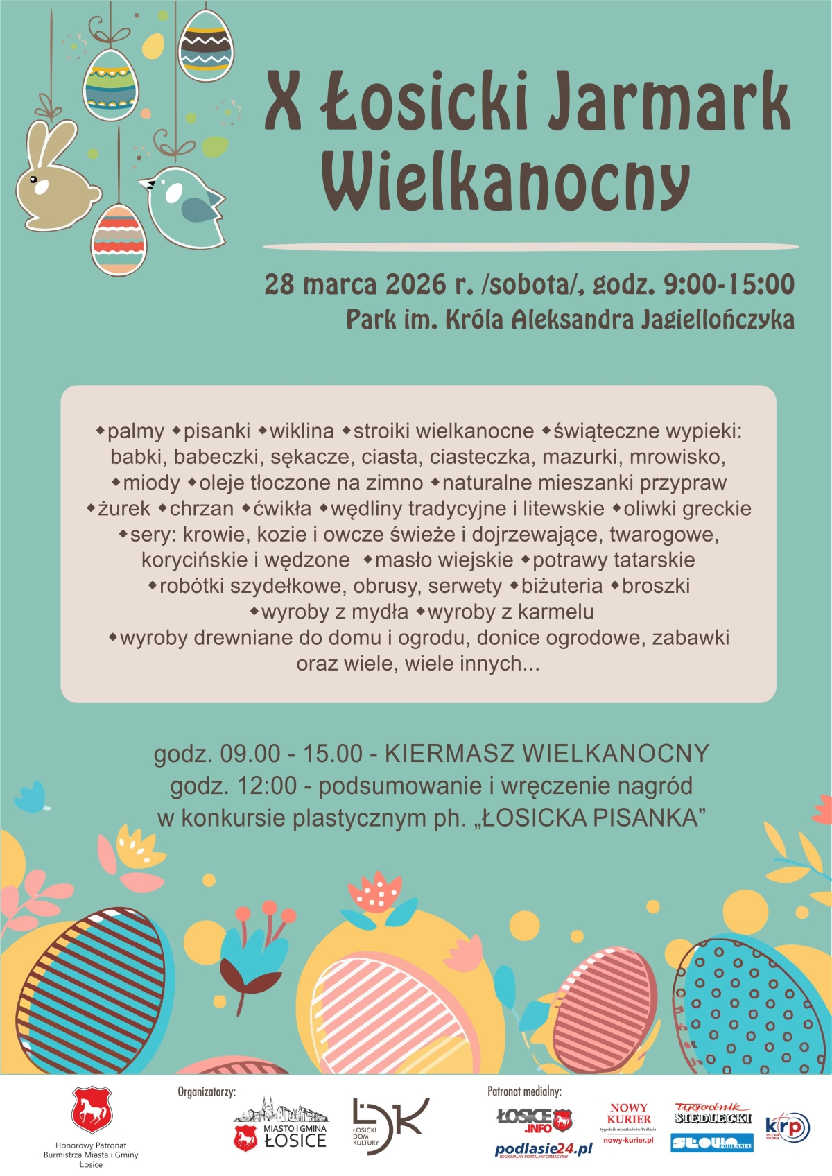 Na odwiedzających będą czekały stoiska z bogatą ofertą produktów regionalnych oraz rękodzieła. Wśród nich znajdą się m.in. tradycyjne ozdoby wielkanocne, palmy, pisanki i stroiki, a także wyroby z wikliny, ręcznie wykonane obrusy i serwety, biżuteria oraz dekoracje do domu i ogrodu.Wydarzeniu towarzyszyć będzie także rozstrzygnięcie konkursu plastycznego „Łosicka Pisanka”. Uroczyste wręczenie nagród zaplanowano na godzinę 12:00.