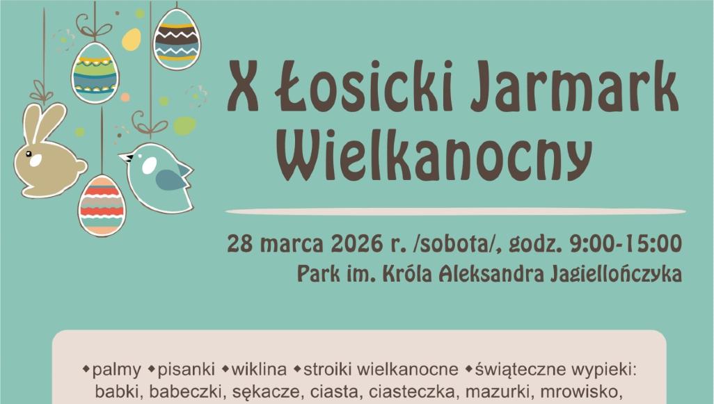 W przeddzień Niedzieli Palmowej, 28 marca, w parku im. Króla Aleksandra Jagiellończyka w Łosicach odbędzie się jubileuszowy X Jarmark Wielkanocny. Na uczestników czeka możliwość zakupu ozdób, żywności oraz palm. Swój udział zapowiedziało blisko 30 wystawców, m.in. z Łosic, Hajnówki, Sokołowa Podlaskiego, Warszawy i Łukowa.