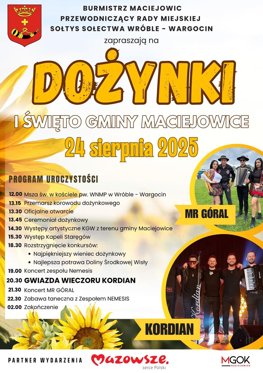 Dożynki to jedno z najpiękniejszych świąt rolników, będące ukoronowaniem ich całorocznego trudu. Tegoroczne dziękczynienie za plony w gminie Maciejowice odbędzie się 24 sierpnia w miejscowości Wróble – Wargocin i połączone będzie ze świętem gminy.