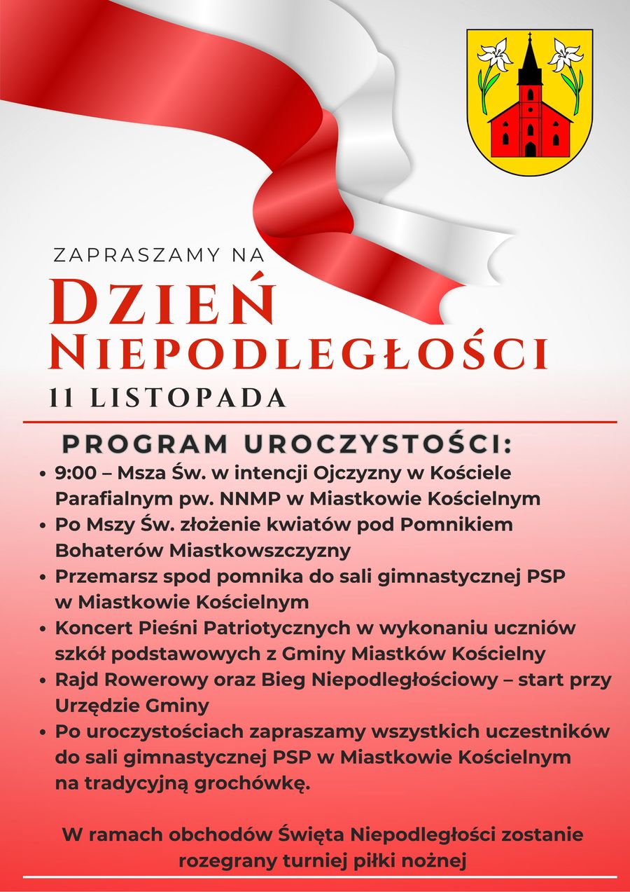 Obchody rozpoczną się tradycyjnie uroczystą Mszą świętą w intencji Ojczyzny, która zostanie odprawiona 11 listopada o godz. 9:00 w kościele parafialnym pw. Nawiedzenia Najświętszej Maryi Panny w Miastkowie Kościelnym.Po nabożeństwie uczestnicy przejdą pod pomnik Bohaterów Miastkowszczyzny, gdzie złożone będą kwiaty i oddany zostanie hołd tym, którzy walczyli o wolność Polski.