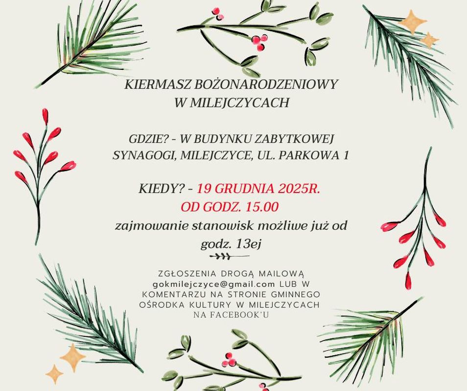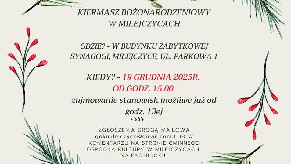 Do udziału zaproszeni są twórcy rękodzieła, producenci lokalnych wyrobów, osoby oferujące świąteczne dekoracje, domowe przetwory i wypieki. Zgłoszenia można przesyłać drogą mailową na adres: gokmilejczyce@gmail.com lub pozostawić w komentarzu na Facebookowej stronie GOK-u. Liczba miejsc jest ograniczona, dlatego warto zgłosić się wcześniej.Na odwiedzających czekać będą świąteczne ozdoby, wyjątkowe prezenty, regionalne smakołyki i rękodzieło przygotowane przez lokalnych wystawców. Kiermasz odbędzie się w wyjątkowej, klimatycznej przestrzeni dawnej synagogi, która podkreśli charakter przedświątecznego spotkania.