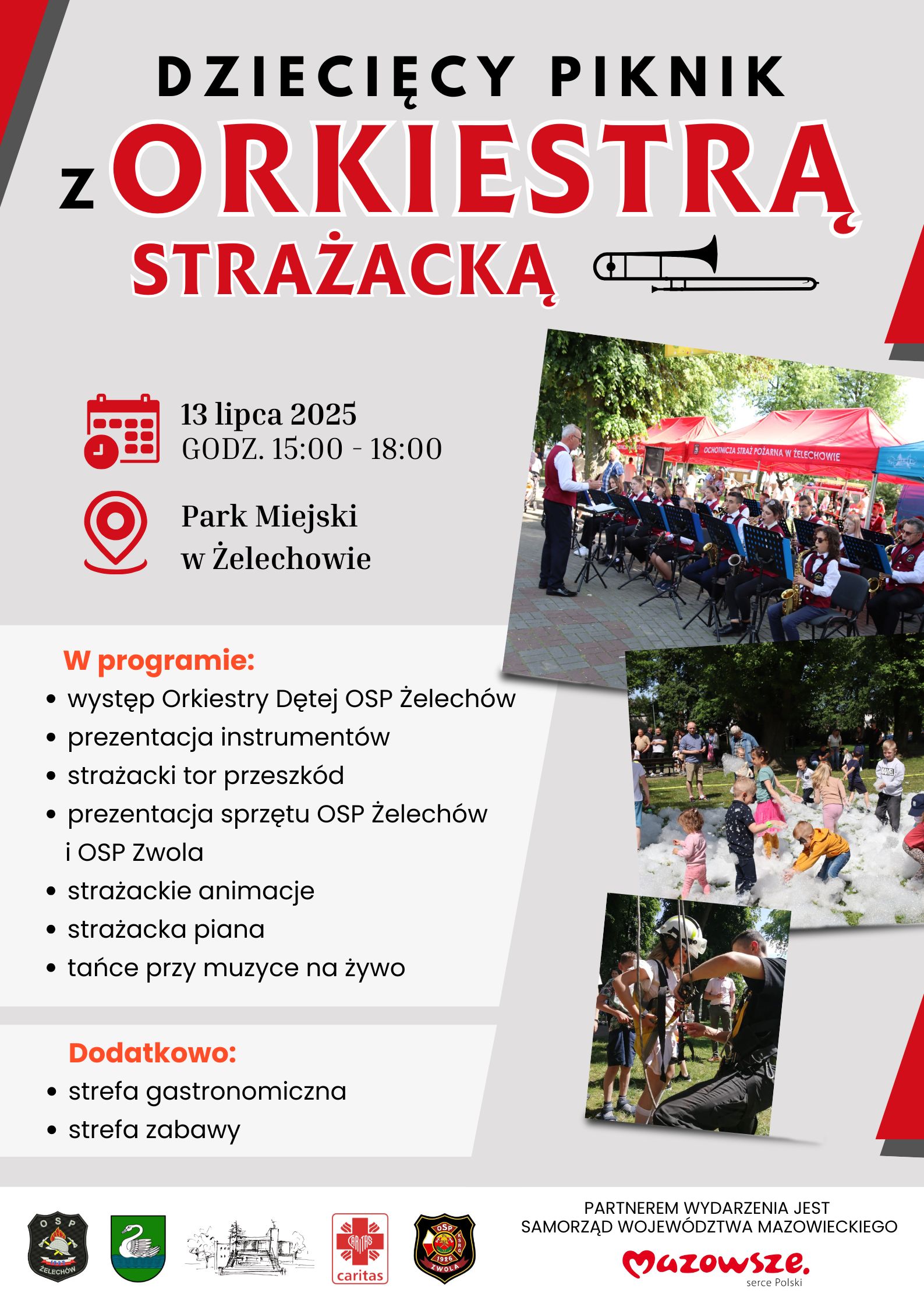 Dziecięcy Piknik z Orkiestrą Strażacką, łączący muzykę, zabawę i edukację, odbędzie się w Parku Miejskim w Żelechowie w niedzielę, 13 lipca, o godzinie 15:00. Uczestnicy będą mogli liczyć na liczne atrakcje przygotowane z myślą o rodzinach i najmłodszych, w tym koncert orkiestry, animacje oraz pokazy sprzętu strażackiego.