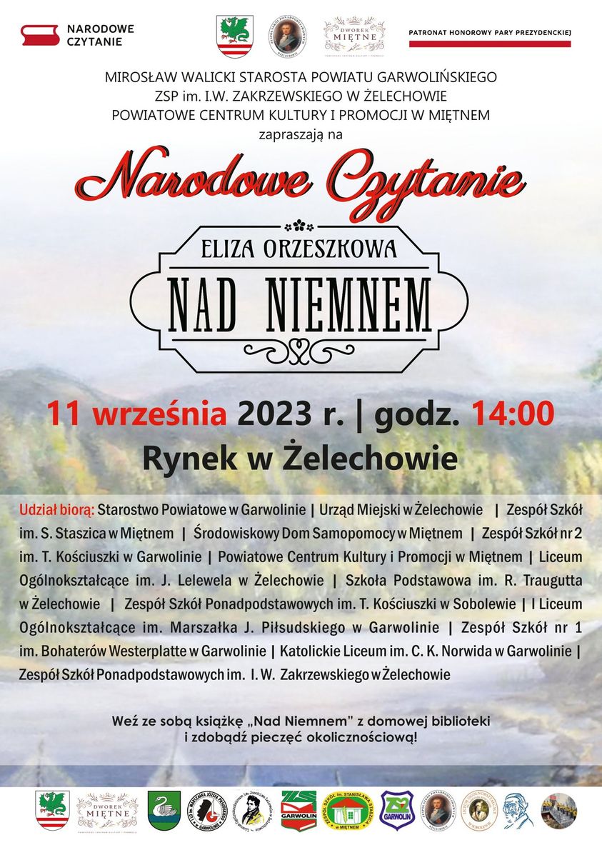 W Narodowym Czytaniu 2023 na żelechowskim rynku wystąpią przedstawiciele władz powiatowych, samorządu Żelechowa, miętneńskiego Zespołu Szkół im. Stanisława Staszica, Środowiskowego Domu Samopomocy w Miętnem, Zespołu Szkół nr 2 im. T. Kościuszki w Garwolinie, Liceum Ogólnokształcącego w Żelechowie, Powiatowego Centrum Kultury i Promocji w Miętnem, Szkoły Podstawowej im. R. Traugutta w Żelechowie, Zespołu Szkół Ponadpodstawowych im.T. Kościuszki w Sobolewie, I Liceum Ogólnokształcące im. Marszałka Piłsudskiego w Garwolinie, Zespół Szkół im. Bohaterów Westerplatte w Garwolinie, Katolickie Liceum Ogólnokształcące im. C.K. Norwida w Garwolinie, Zespół Szkół Ponadpodstawowych im. I.W. Zakrzewskiego w Żelechowie.Narodowe Czytanie organizowane jest przez Prezydenta RP od 2012 roku. Zostało zainicjowane wspólną lekturą Pana Tadeusza Adama Mickiewicza. W 2013 roku w całej Polsce odbyło się czytanie dzieł Aleksandra Fredry, a podczas następnych edycji przeczytano kolejno: „Trylogię” Henryka Sienkiewicza, „Lalkę” Bolesława Prusa, „Quo Vadis” Henryka Sienkiewicza, „Wesele” Stanisława Wyspiańskiego, „Przedwiośnie” Stefana Żeromskiego, zbiór 8 nowel (autorstwa Elizy Orzeszkowej, Marii Konopnickiej, Bolesława Prusa, Brunona Schulza, Władysława Stanisława Reymonta, Stefana Żeromskiego, Henryka Sienkiewicza i Henryka Rzewuskiego), „Balladynę” Juliusza Słowackiego i „Moralność Pani Dulskiej Gabrieli Zapolskiej i w roku ubiegłym „Ballady i romanse” Adama Mickiewicza.