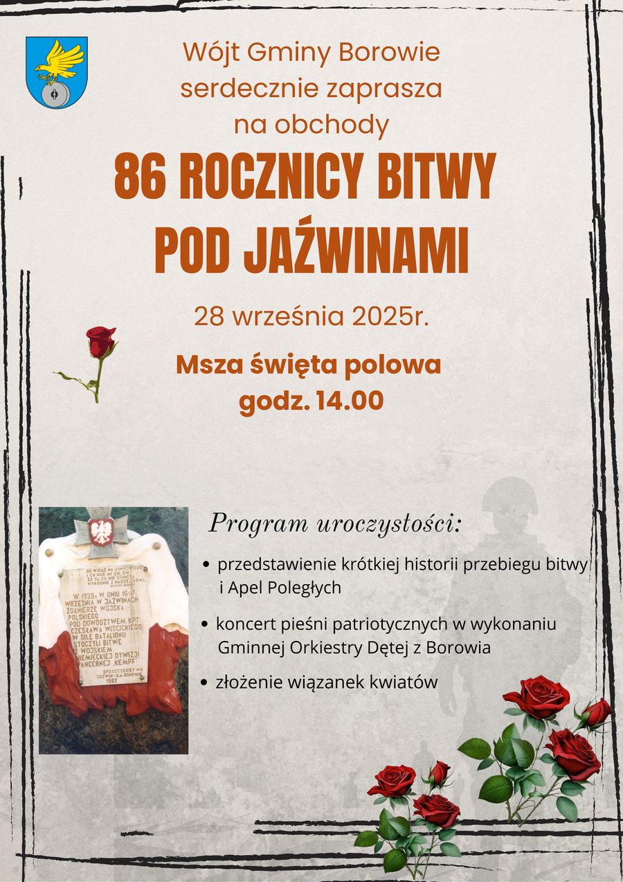 Uroczystości rozpoczną się 28 września o godz. 14:00 Mszą św. polową sprawowaną przez proboszcza parafii w Borowiu ks. Marka Kukiela, następnie będzie krótkie przedstawienie historii przebiegu bitwy i Apel Poległych, który poprowadzi st. sierż. Sebastian Całka. Po koncercie pieśni patriotycznych w wykonaniu Gminnej Orkiestry Dętej w Borowiu, nastąpi złożeniu kwiatów i zapaleniu zniczy przy obelisku .Bitwa pod Jaźwinami stoczona została w dniach 16-17 września 1939. We wsi stacjonował oddział wojska polskiego liczący ok. 300 żołnierzy, którymi dowodził kpt. Czesław Wiścicki. Atak wojsk niemieckich na Jaźwiny rozpoczął się w godzinach popołudniowych. Niemcy liczebnie i wyposażeniem znacznie przewyższali Polaków, którzy dysponowali zaledwie dwoma działami, pięcioma ckm-ami i kilkoma rkm-ami. Żołnierze niemieccy przypuścili atak z karabinów maszynowych, ostrzeliwując nie tylko oddział wojskowy, ale i wieś. Mimo olbrzymiej przewagi długo nie mogli zdobyć polskich pozycji. Po około dwóch godzinach udało się nieprzyjacielowi rozbić oddział polski. Większość żołnierzy wycofała się, poległo 24, a ok. 40 dostało się do niewoli.