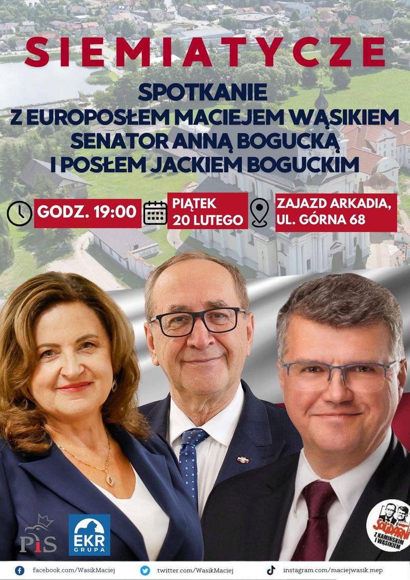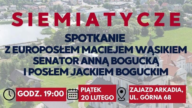 W Siemiatyczach odbędzie się spotkanie z udziałem europosła Macieja Wąsika, senator Anny Boguckiej oraz posła Jacka Boguckiego. Zapowiedziano poruszenie kwestii istotnych zarówno dla Polski, jak i regionu podlaskiego.
