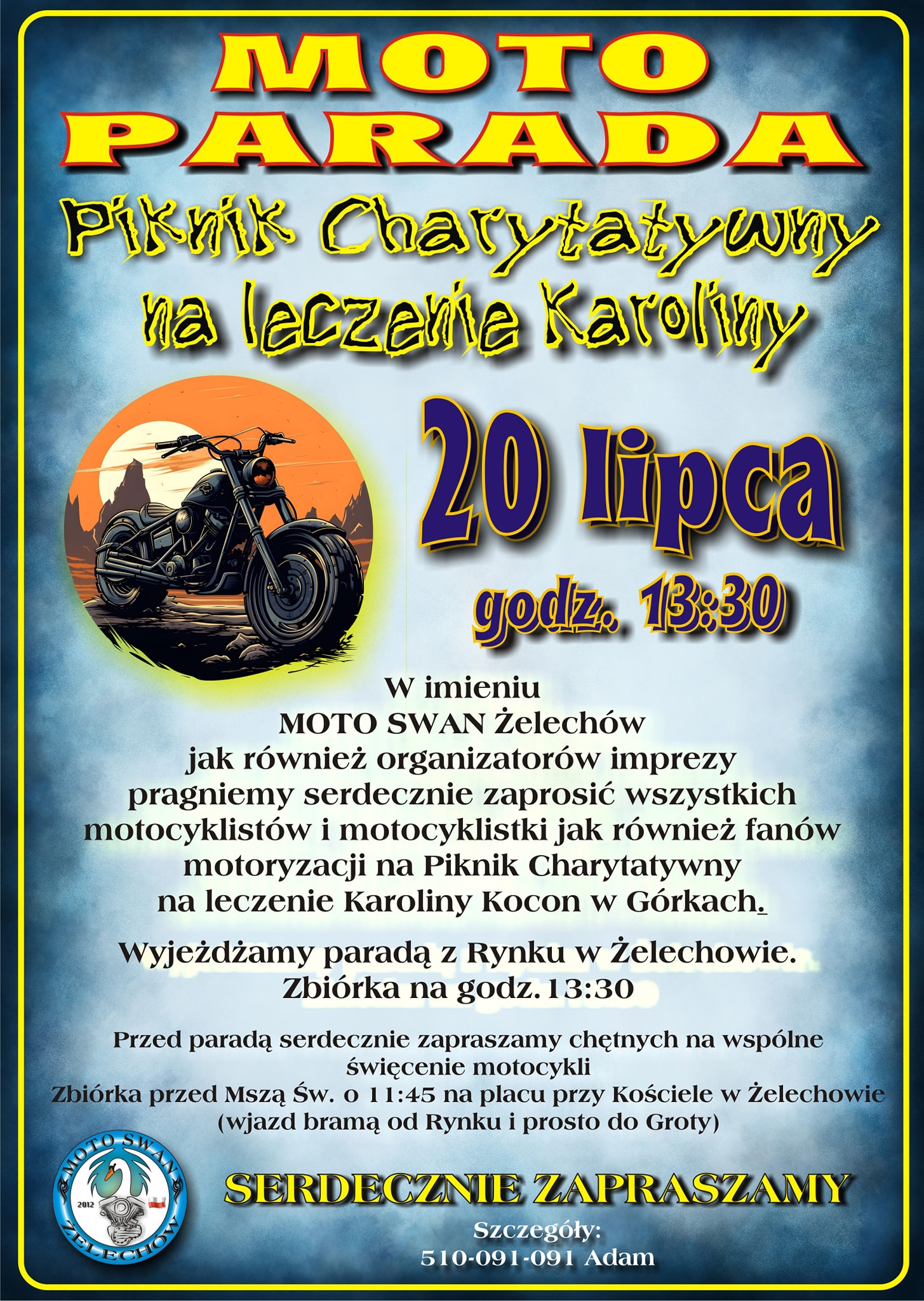 Zaplanowano szereg atrakcji, z których dochód zostanie przeznaczony na leczenie. Na miejscu dostępna będzie również strefa dla dzieci oraz strefa gastronomiczna. Dodatkowym punktem programu będzie Moto Parada – motocykliści z grupy MOTO SWAN Żelechów wyruszą wspólnie z Rynku w Żelechowie o godz. 13:30, by zakończyć przejazd na pikniku w Górkach. Wcześniej, o godz. 11:45, zaplanowano poświęcenie motocykli przy kościele w Żelechowie.Każda obecność i każda wpłata mają znaczenie.
