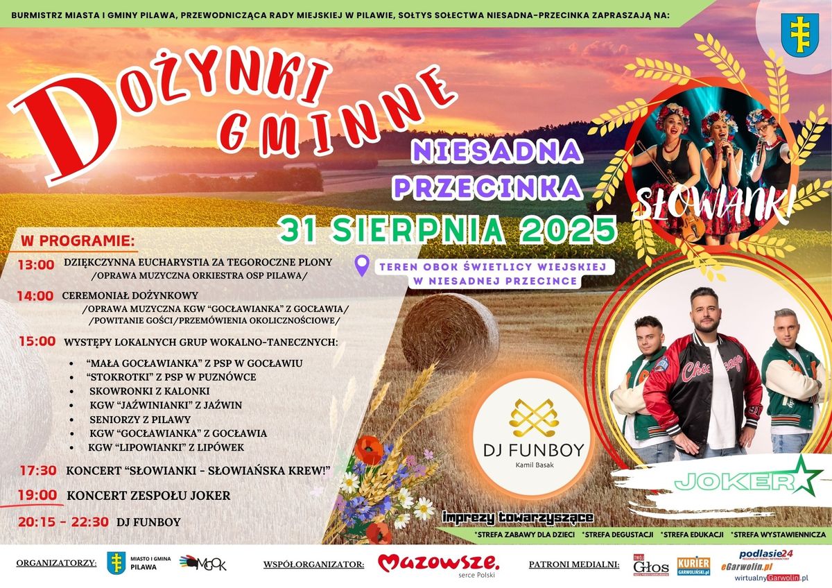 Po nabożeństwie barwny korowód przemaszeruje – w asyście orkiestry dętej OSP Pilawa – na teren obok świetlicy wiejskiej, gdzie od godz. 14:00 rozpocznie się ceremoniał dożynkowy. Od godz. 15:00 na estradzie prezentować się będą lokalne zespoły: „Mała Gocławianka” z PSP Gocław, „Stokrotki” z PSP Puznówka, „Skowroneczki” z Kalonki, KGW „Jaźwinianki” z Jaźwin, seniorzy z Pilawy, KGW „Gocławianki” z Gocławia oraz KGW „Lipowianki” z Lipówek.O godz. 17:30 zaplanowano koncert „Słowianki – Słowiańska krew”, po którym wystąpi zespół Joker, a na zakończenie do godz. 22:30 grać będzie DJ Funboy.