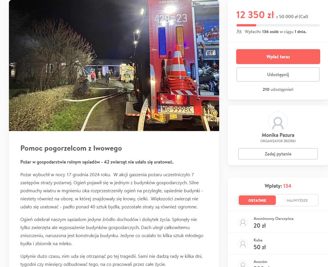„Upłynie dużo czasu, zanim uda się naszym sąsiadom otrząsnąć po tej tragedii. Sami nie dadzą rady w kilka dni, tygodni czy miesięcy odbudować tego, na co pracowali przez całe życie. Jesteśmy pewni, że z Waszym wsparciem będzie im choć odrobinę łatwiej w tych trudnych chwilach . Każda, nawet najmniejsza wpłata pomoże w odzyskaniu tego, co zabrał im ogień” - napisali inicjatorzy zbiórki funduszy na rzecz poszkodowanego rolnika.