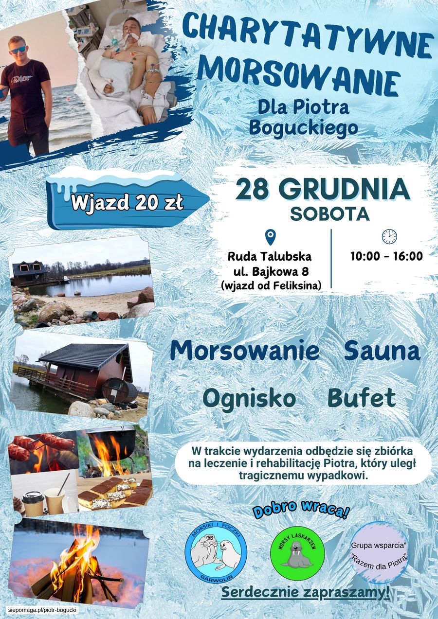 „Łącząc przyjemne z pożytecznym, będziemy mogli w trakcie wydarzenia wesprzeć zbiórkę pieniędzy dla Piotrka Boguckiego na leczenie i rehabilitację po wypadku komunikacyjnym”- zachęcają do wspólnego morsowania i saunowania Morsy Łaskarzew, Morsiki i Foczki Garwolin oraz Grupa Wsparcia „Razem dla Piotra”.