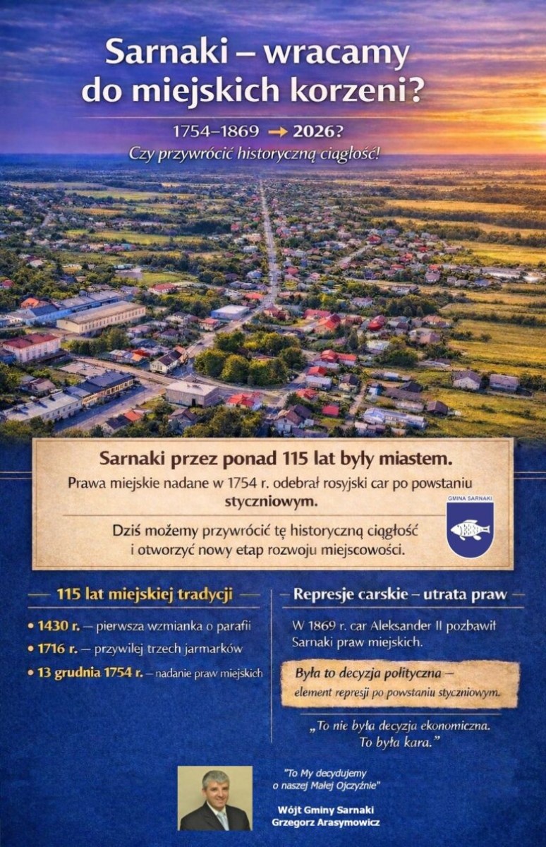 Miejscowość Sarnaki rozpoczyna starania o odzyskanie praw miejskich. Wójt gminy Sarnaki, Grzegorz Arasymowicz, ogłosił konsultacje społeczne dotyczące nadania miejscowości statusu miasta.