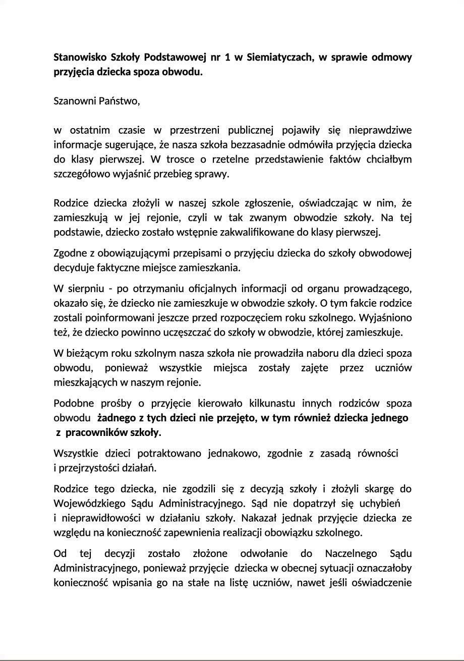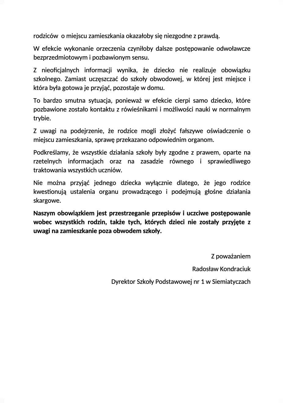 Z kolei dyrektor szkoły, Radosław Kondraciuk, wydał kilka dni temu, już po decyzji WSA oficjalne stanowisko, w którym tłumaczy, że odmowa przyjęcia dziecka była zgodna z przepisami. „Zgodnie z obowiązującym prawem o przyjęciu dziecka do szkoły obwodowej decyduje faktyczne miejsce zamieszkania. W naszym przypadku otrzymaliśmy informacje, że dziecko nie mieszka w obwodzie szkoły” – dodaje.