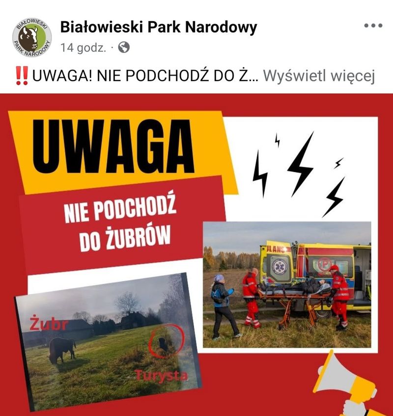 W Teremiskach, (powiat hajnowski, gmina Białowieża) grupa turystów podeszła bardzo blisko do znajdującego się tam byka żubra. W rezultacie jedna z osób chcąca zrobić zdjęcie została poturbowana i trafiła do szpitala.Z apelem o rozsądne zachowanie przy spotkaniu z żubrem i przestrzeganie bezpiecznego dystansu - minimum 50m – po raz kolejny do mieszkańców i turystów zwraca się Białowieski Park Narodowy. - Żubr to zwierzę duże, silne, szybkie. Jeśli nie przestrzegamy jego strefy komfortu, może zachować się agresywnie - podkreślają eksperci i apelują, aby nie zwabiać żubrów karmą w pobliże domów.