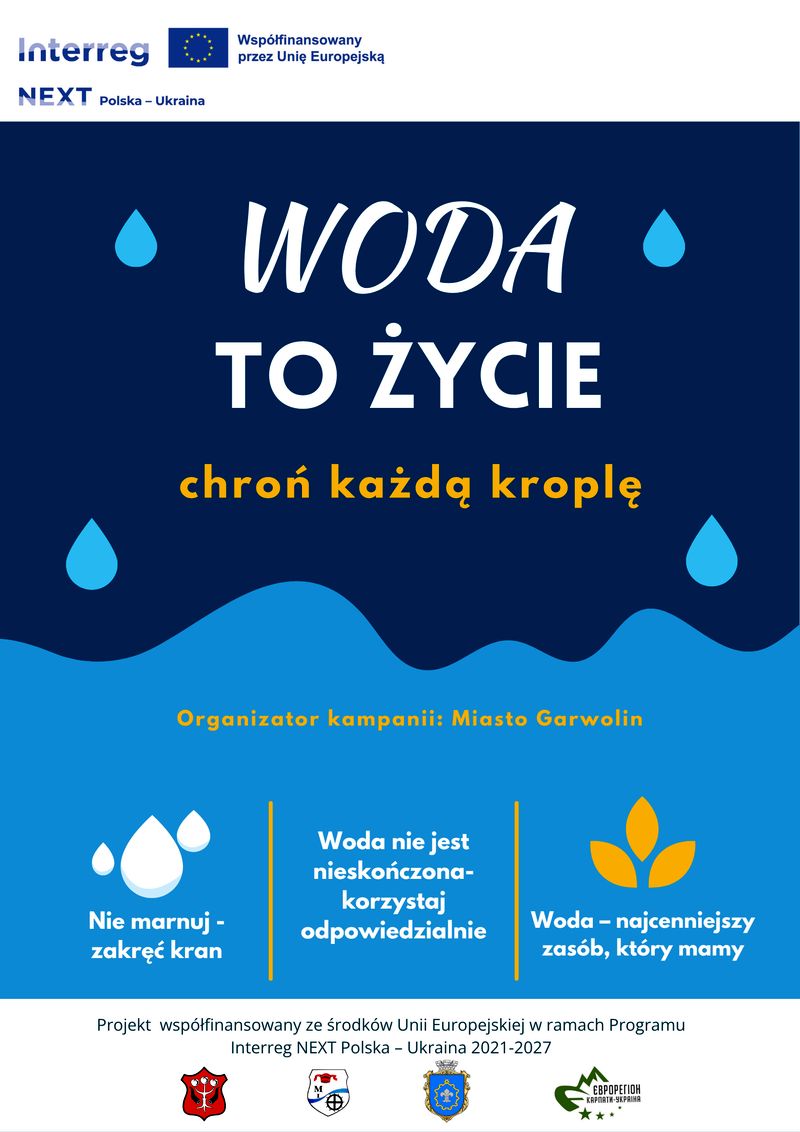 Woda towarzyszy nam każdego dnia - korzystamy z niej w domu, w pracy, podczas odpoczynku. Choć wydaje się czymś oczywistym i łatwo dostępnym, jej zasoby nie są niewyczerpane. Dlatego Miasto Garwolin rozpoczyna kampanię edukacyjną „Woda to życie. Chroń każdą kroplę”, której celem jest zwiększenie świadomości mieszkańców na temat ochrony wody i zachęcenie do codziennych, prostych działań na rzecz środowiska.