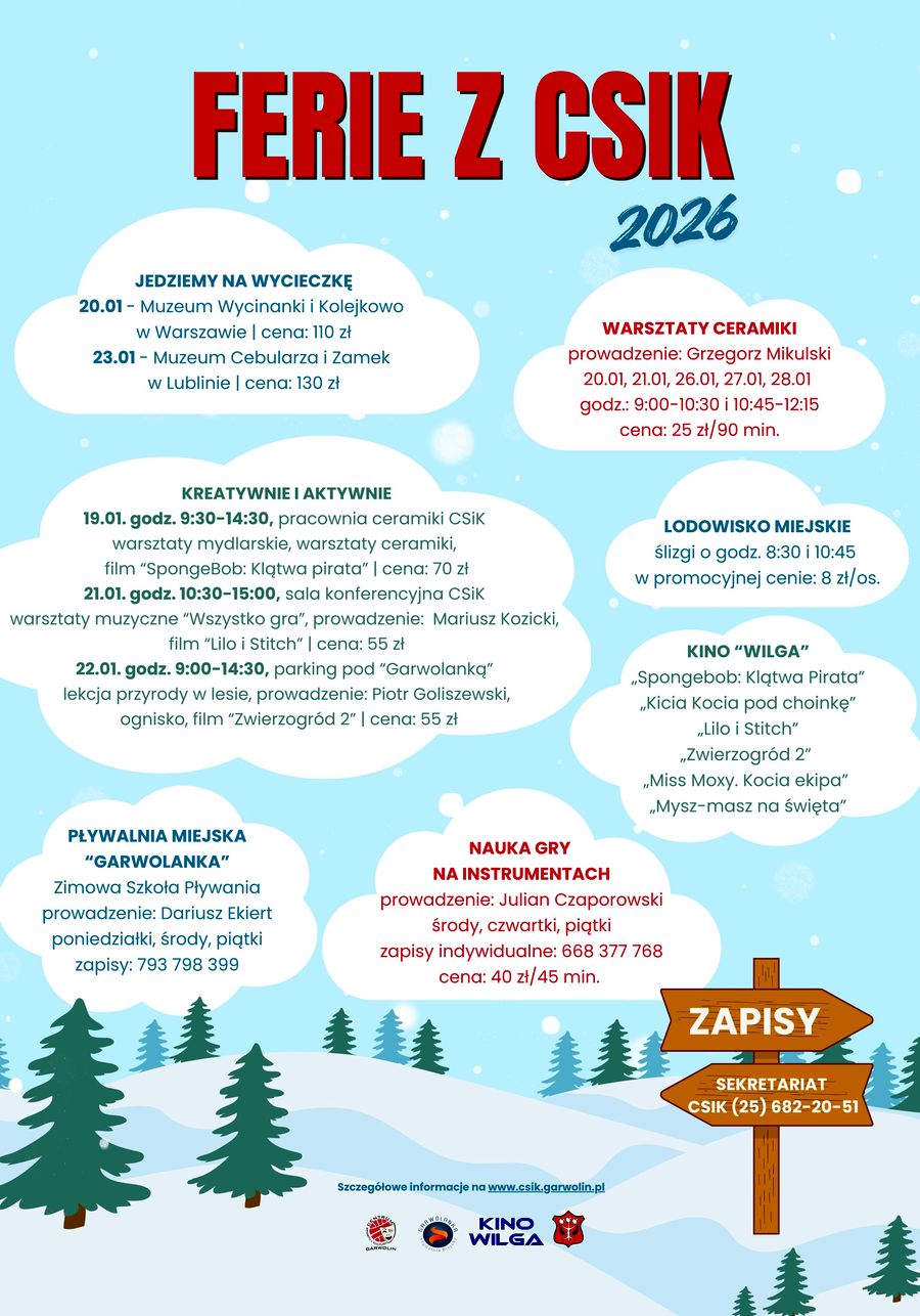 Ferie w województwie mazowieckim rozpoczną się 19 stycznia i potrwają do 1 lutego. W Garwolinie ten czas będzie obfitował w atrakcje dla dzieci lubiących sport i kulturę – szczególnie pierwszy tydzień ferii zapowiada się niezwykle aktywnie! Centrum Sportu i Kultury organizuje dwie całodniowe wycieczki oraz bloki zajęć stacjonarnych i w terenie. Będą także warsztaty w pracowni ceramiki i lekcje gry na instrumentach klawiszowych, które poprowadzi maestro Julian Czaporowski. Nie zabraknie także seansów familijnych w Kinie „Wilga” oraz sportowych uciech w Pływalni Miejskiej „Garwolanka” i na Lodowisku Miejskim, które w ferie oferuje ślizgi w promocyjnych cenach.Ferie w mieście, a nawet w kilku miastach