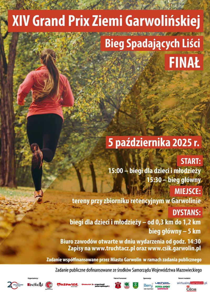 Jesień witana na sportowo. Finałowe zawody XIV Grand Prix Ziemi Garwolińskiej odbędą się w niedzielę, 5 października, na terenach przy zbiorniku retencyjnym w Garwolinie. „Bieg Spadających Liści” zamknie tegoroczny cykl i pozwoli wyłonić laureatów klasyfikacji generalnej. Udział mogą wziąć dorośli, seniorzy oraz dzieci. Nadal możliwe są zapisy.